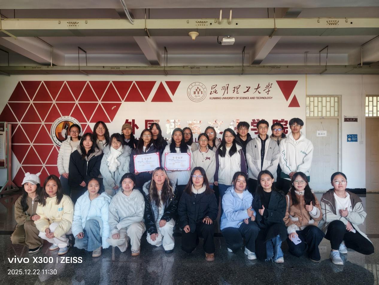 2025年12月19日,由学生工作部主办的“青春六力·筑梦中国”精品主题班会现场展示评选活动在呈贡校区管经楼D102报告厅圆满落幕。来自全校各学院的师生代表共150余人齐聚现场,共同见证优秀主题班会的风采。经过前期组织申报、学院遴选、专家评审等多轮严格筛选,外国语言文化学院243班凭借精心策划的“语通世界,科创报国——理工青年的家国叙事”主题班会脱颖而出,最终荣获“最佳风采奖”与“十佳主题班会”2项殊荣。