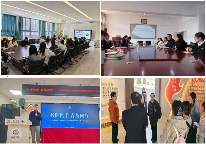 3月23日上午,外国语言文化学院2026届本科毕业生教育类实习见面会分别在昆明理工大学附属小学、昆明理工大学附属中学、昆明理工大学附属呈贡学校、昆明理工大学附属雨花学校四所实习基地举行。学院2026届43名实习学生开启教育类集中专业实习。