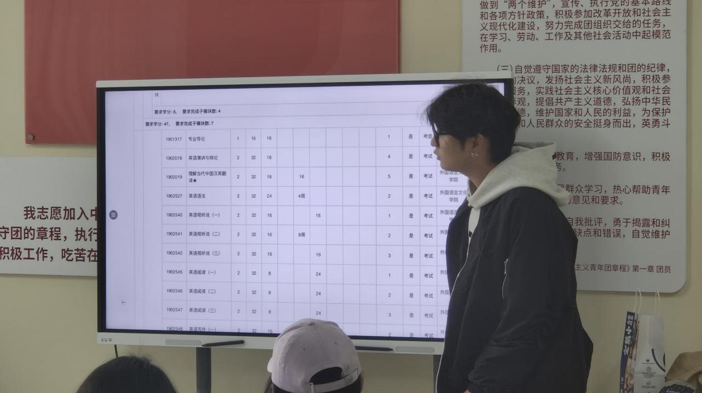分享会上,余鑫结合大学学习生活经历,围绕“英专生成长之路:语言学习到复合型发展”分享了宝贵的心得与实用的技巧。他不仅详细介绍了英语专业各门核心课程的特点及应对策略,还就如何利用日常时间提升自身能力提供了具体建议。针对大一同学习惯转变、大二同学面临专业深化与社团管理工作平衡等普遍性问题进行了经验分享,并提出制定明确学习规划和培养英专生专业能力的重要性。