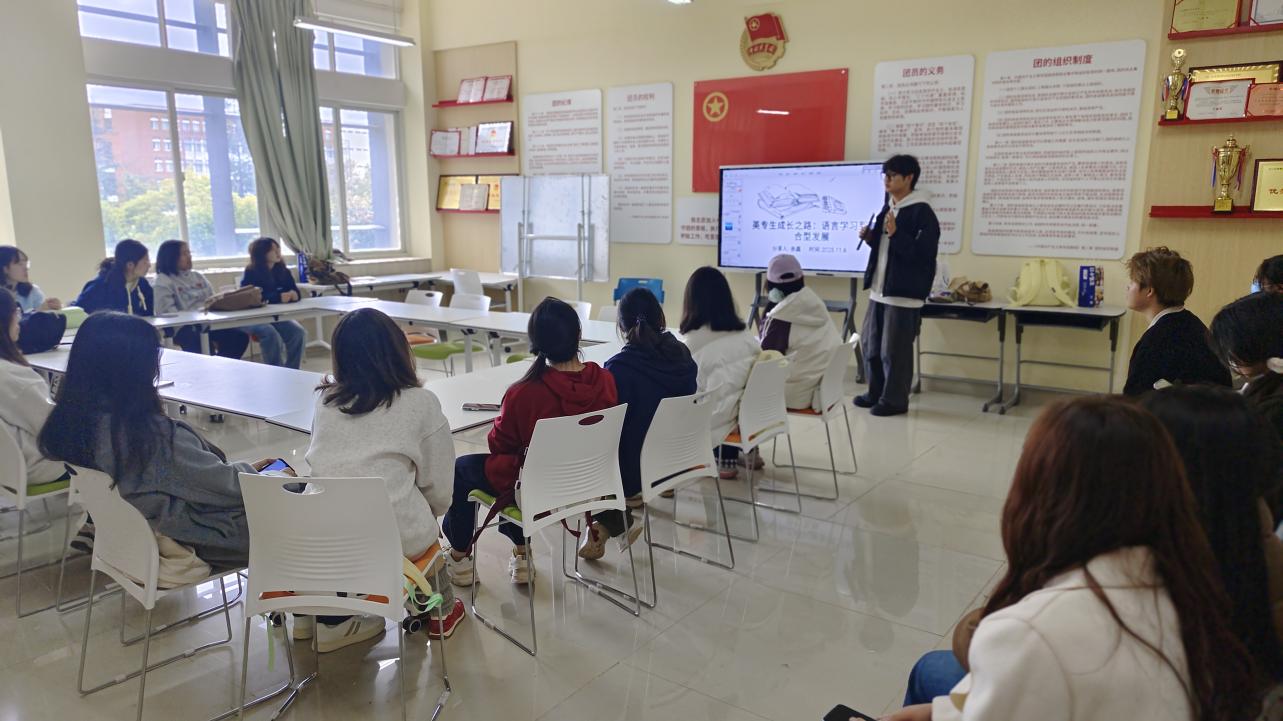 2025年11月6日,昆明理工大学外国语言文化学院翻译社举办了英语学习经验分享活动。本次活动旨在帮助大一同学更好地适应大学英语学习节奏,掌握高效学习方法和未来职业生活规划。讲座邀请学院2022级余鑫同学进行分享,翻译社全体成员参加活动。